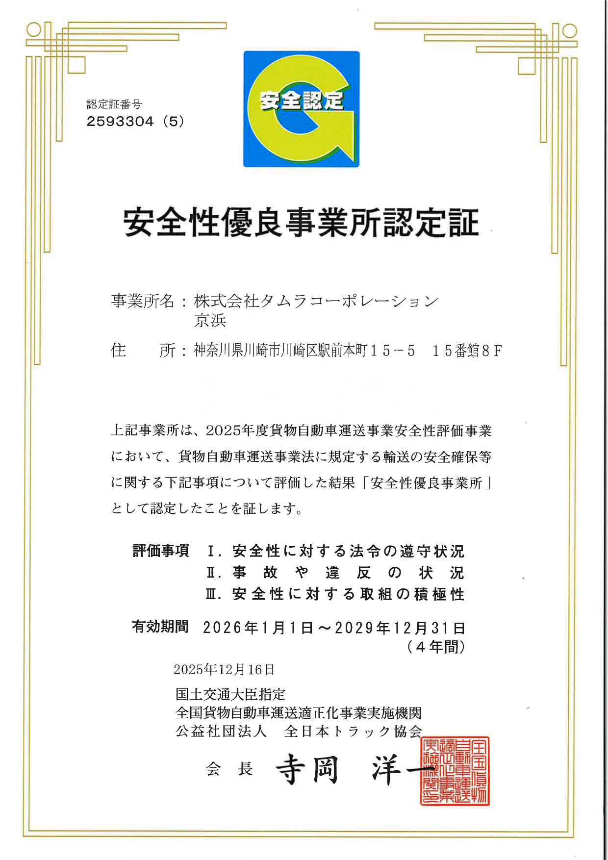 株式会社タムラコーポレーションは、お客様により 安全性の高いトラック運送事業をご提供させていただくため、全国貨物自動車送適性化事業実施機関である社団法人全日本トラック協会に評価され、「安全性優良事業所」として認定取得しました。